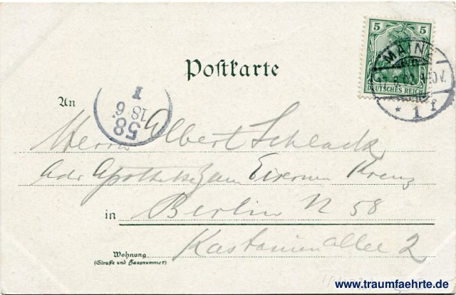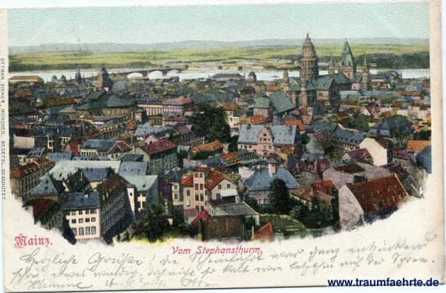 – Details – Jahr: ca. 1900 Status: gelaufen 1902 Beschriftung vorne: Mainz. Vom Stephansthurm. Beschriftung hinten: Postkarte, An ... in ... Wohnung (Straße und Hausnummer) ... Stempel: Mainz, * 1 f, 17.6.02. 9-10V.; 58, 18 6, I Hinweis: