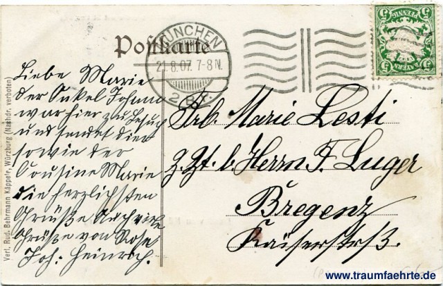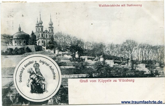 – Details – Jahr: ca. 1905 Status: gelaufen 1907 Beschriftung vorne: Gruß vom Käppele zu Würzburg, Wallfahrtskirche mit Stationsweg, Gnadenbild sasselbst, Original-Aufnahme Beschriftung hinten: Postkarte, Verl. Rud. Behrmann, Käppele, Würzburg (Nachdr. Verboten) Stempel: München, 2 B.P. 21.8.07. 7-8N.; ~~~ Hinweis: