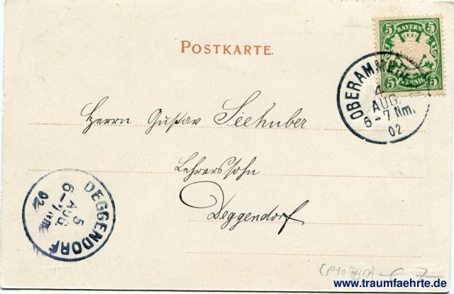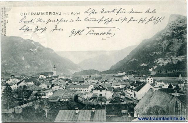 – Details – Jahr: ca. 1900 Status: gelaufen 1902 Beschriftung vorne: Oberammergau mit Kofel, Verlag v. B Johannes. Patenkirchen – Garmisch, No. 320 Beschriftung hinten: Postkarte. Stempel: Oberammergau, 4 Aug 02, 6-7 Nm.; Deggendorf, 5 Aug 02, 6-7 Nm. Hinweis: