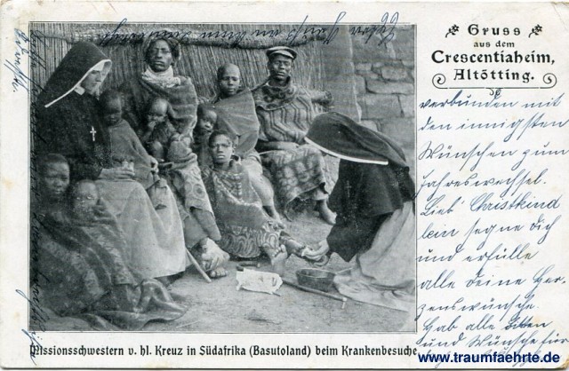 – Details – Jahr: ca. 1910 Status: gelaufen 1913 Beschriftung vorne: Gruss aus dem Crescentiaheim Altötting. Missionsschwestern v. hl. Kreuz in Südafrika (Basutoland) beim Krankenbesuche. Beschriftung hinten: Postkarte Stempel: Altötting, 31 Dez 13, 6-7 Nm Hinweis: