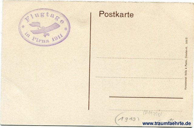 – Details – Jahr: ca. 1910 Status: ungelaufen Beschriftung vorne: Pirna a. Elbe Beschriftung hinten: Postkarte, Kunstanstalt Krille & Martin, Dresden-A. 500 B Stempel: Flugtage in Pirna 1911 Hinweis: