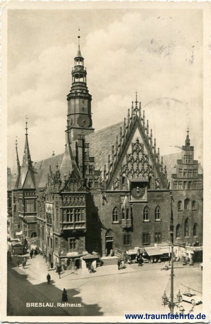 Ansichtskarte Rathaus / Ratusz in Breslau / Wrocław [ Permalink ]Schlagworte: Rathäuser, Regierungsgebäude, Ladengeschäfte, Uhren, Türme, Oldtimer, Laternen, Ostgebiete, Schlesien