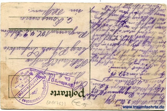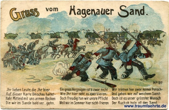 – Details – Jahr: ca. 1910 Status: gelaufen ohne Briefmarke (Feldpost), 1914 Beschriftung vorne: Gruss vom Hagenauer Sand. Ihr lieben Leute, die Ihr hier / Auf dieser Karte Umschau haltet – / Habt Mitleid mit uns armen Recken / Die wir im Sande bald ver...gehen / Ein gross Vergnügen ist's zwar nicht / Wie Ihr hier seht, zu exerzieren / Doch freudig tun wir unsre Pflicht / Weil wir im Sommer hier nicht-frieren / Wir trinken hier zwar keinen Punsch – / Und gehen wie auch weichem Samt – / Doch ist es unsrer grösster Wunsch / Der Kuckuk hole all den Sand. No. 97 Beschriftung hinten: Postkarte Stempel: Straßbourg Els. P [...]; Briefstempel, Königlich Preussisches 1. Ers.-[...] Unter-El[säss.] Infant. Regmt. Nr. 137 Hinweis: