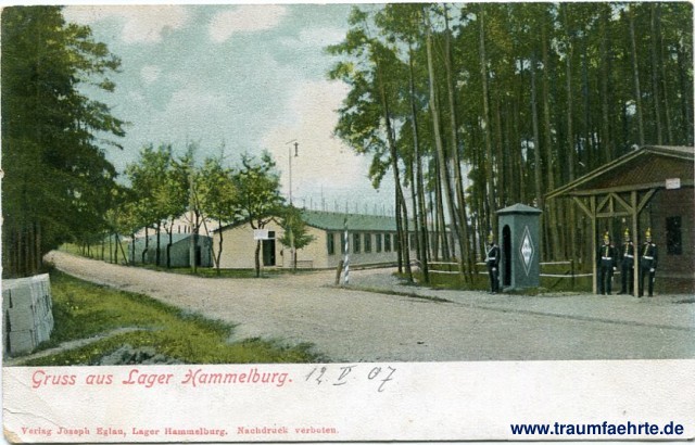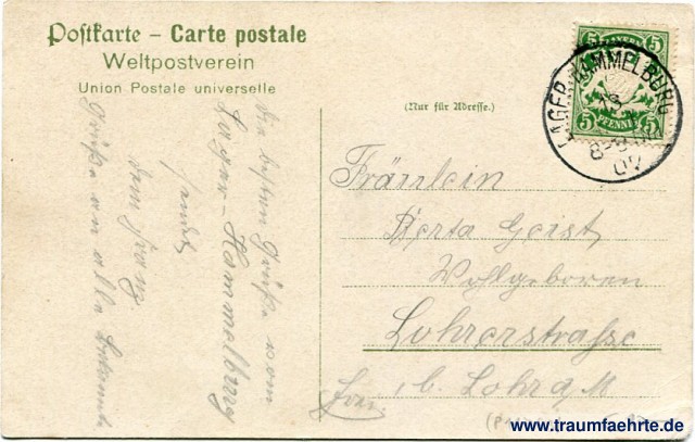 – Details – Year: ca. 1905 Postal state: postally used 1907 Inscription front: Gruss aus Lager Hammelburg. Verlag Joseph Eglau, Lager Hammelburg. Nachdruck verboten. Inscription back: Postkarte – Carte postale, Weltpostverein, Union Postale universelle, (Nur für Adresse.) Postmark(s): Lager Hammelburg, 13 Mai 07, 8-9 Nm. Please note: