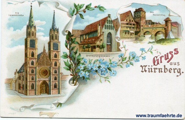 – Details – Year: ca. 1900 Postal state: postally unused Inscription front: Gruss aus Nürnberg. Die Lorenzkirche, Bratwurstglöcklein, Der Henkersteg, No 287. Inscription back: Postkarte. An ... in ... Postmark(s): none Please note: