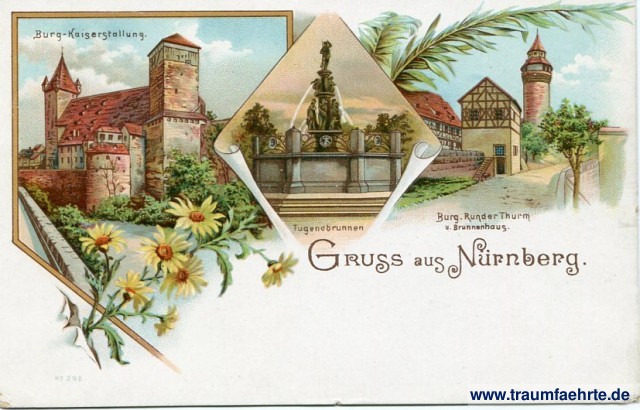 – Details – Year: ca. 1900 Postal state: postally unused Inscription front: Gruss aus Nürnberg. Burg-Kaiserstallung. Jugendbrunnen, Burg. Runder Thurm u. Brunnenhaus. No 292. Inscription back: Postkarte. An ... in ... Postmark(s): none Please note: