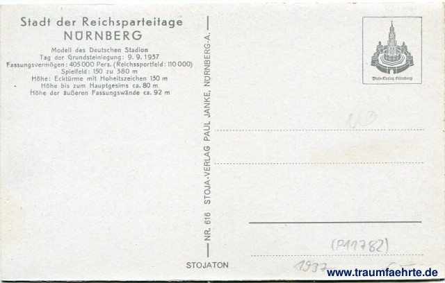– Details – Jahr: 1937 Status: ungelaufen Beschriftung vorne: Das Deutsche Stadium zu Nürnberg, Stoja Beschriftung hinten: Stadt der Reichsparteitage Nürnberg, Modell des Deutschen Stadion, Tag der Grundsteinlegung: 9.9.1937, Fassungsvermögen: 405000 Pers. (Reichssportfeld: 110000), Spielfeld: 150 zu 350 m, Höhe: Ecktürme mit Hoheitszeichen 130 m, Höhe bis zum Hauptgesims ca. 80 m, Höhe der äußeren Fassungswände ca. 92 m, Stojaton, Nr. 616 Stoja-Verlag Paul Janke, Nürnberg-A. Stoja-Verlag Nürnberg Stempel: keine Hinweis: