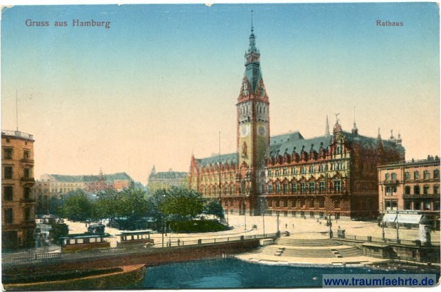 Schlagworte: Rathäuser, Regierungsgebäude, Türme, Uhren, Binnenalster, Alster, Flüsse, Schiffe, Straßenbahnen, Grußkarten
