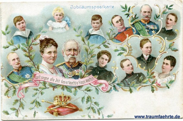 Beschriftung vorne: Jubiläumspostkarte. Gott segne alle Zeit das erlauchte Haus Wettin