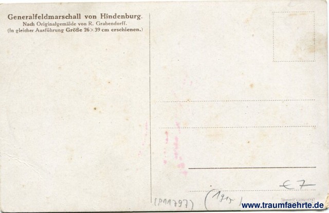– Details – Jahr: 1925 Status: ungelaufen Beschriftung vorne: von Hindenburg. Beschriftung hinten: Generalfeldmarschall von Hindenburg. Nach Originalgemälde von R. Grabendorff. (In gleicher Ausführung Größe 26 x 39 cm erschienen.) Graphische Kunstanstalten F. Bruckmann A-G., München Stempel: keine Hinweis: