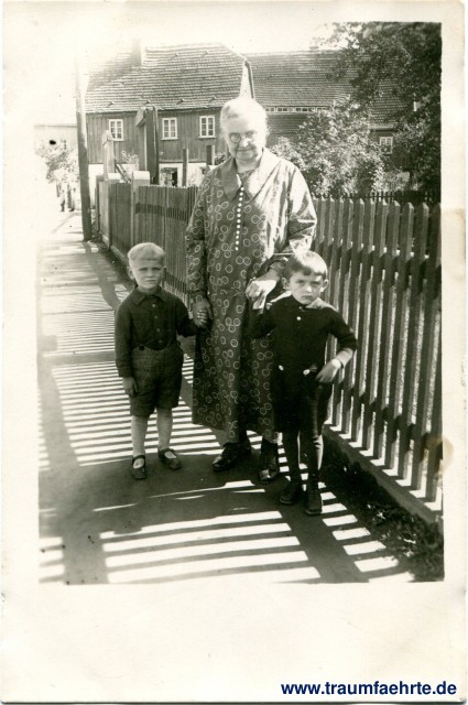 Schwarzweißfotografie – Portrait einer alten Frau mit zwei Jungen an einem Holzzaun, Haus im Hintergrund