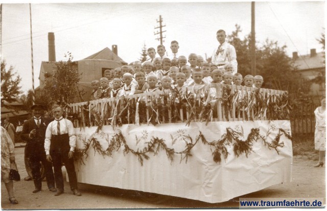 sepiafarbene Schwarzweißfotografie – Gruppenfoto von Kindern in Festkleidung und einzelnen Erwachsenen