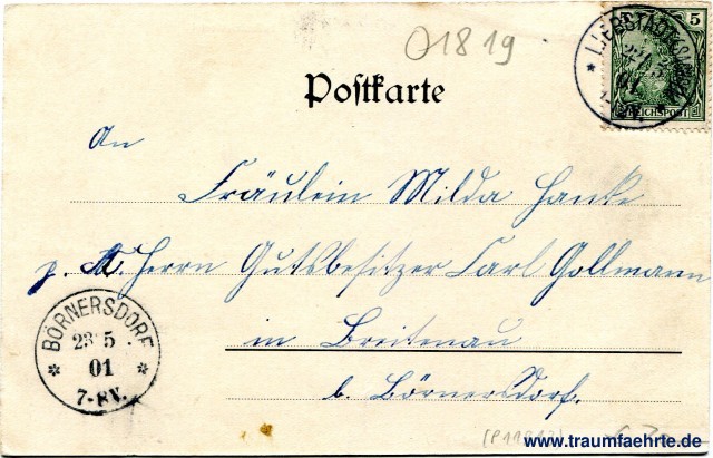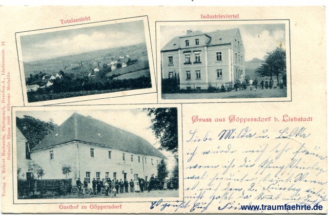 – Details – Jahr: ca. 1900 Status: ungelaufen Beschriftung vorne: Gruss aus Göppersdorf b. Liebstadt, Totalansicht, Industrieviertel, Gasthof zu Göppersdorf, Verlag v. Robert Bachstein, Photograph, Dresden-A., Lindenstr. 14, Prämiirt Nizza 1899 Silberne Medaille Beschriftung hinten: Postkarte Stempel: Liebstadt (Sachsen), 22 / 5 01, * 11-12V. *; Börnersdorf, 23 5 01, * 7-8V. * Hinweis: