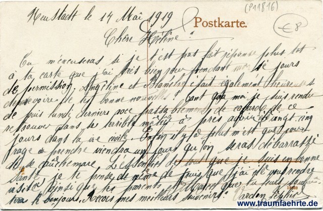 Zustand: untere linke Ecke mit leichten Knickspuren, untere rechte Ecke etwas bestoßen, Karte minimal verschmutzt, Rückseite beschrieben obwohl unbeschrieben (datiert: 14. Mai 1919)