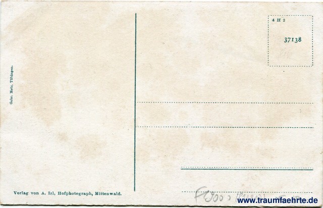 – Details – Jahr: ca. 1900 Status: ungelaufen Beschriftung vorne: Mittenwald a. Isar, Obermarkt Beschriftung hinten: Verlag von A. Irl, Hofphotograph, Mittenwald. Gebr. Metz, Tübingen. 4 H 2, 37138 Stempel: keine Hinweis: