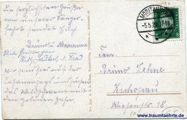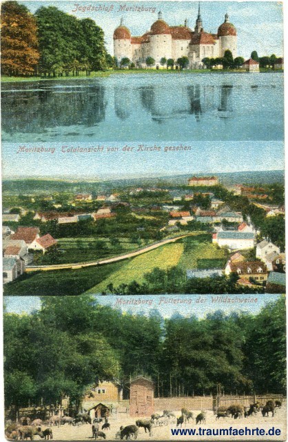 – Details – Year: ca. 1925 Postal state: postally used 1925 Inscription front: Jagdschloß Moritzburg, Moritzburg, Totalansicht von der Kirche gesehen, Moritzburg, Fütterung der Wildschweine Inscription back: No. 3051 A. & R. Adam, Kunstverlag, Dresden-A., Annenstr. 26 Postmark(s): Moritzburg, * * *, -5.5.29. 17-18 Please note: