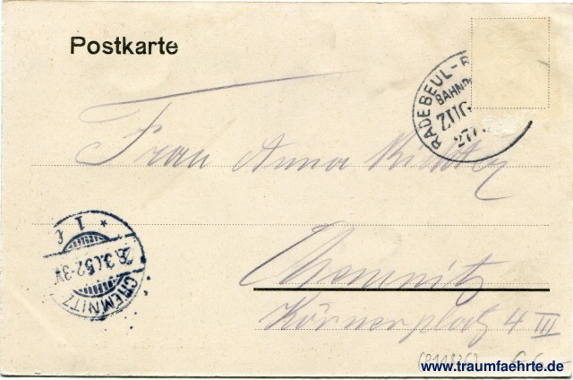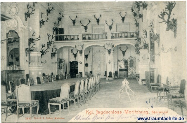 – Details – Year: 1902 Postal state: postally used 1905 (rail mail), stamp removed Inscription front: Kgl. Jagdschloss Moritzburg. Speisesaal. 2687 Brück & Sohn, Meissen. Inscription back: Postkarte Postmark(s): Radebeul – R[adeburg?], Bahnp[ost], Zug [...] 277 [...]; Chemnitz, * 1 [...], 28.3.05 2-3V Please note: