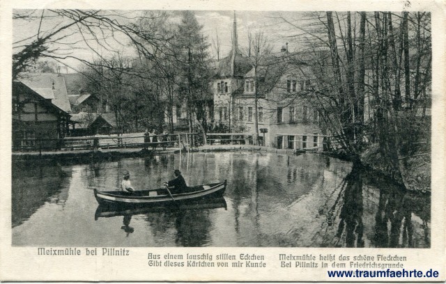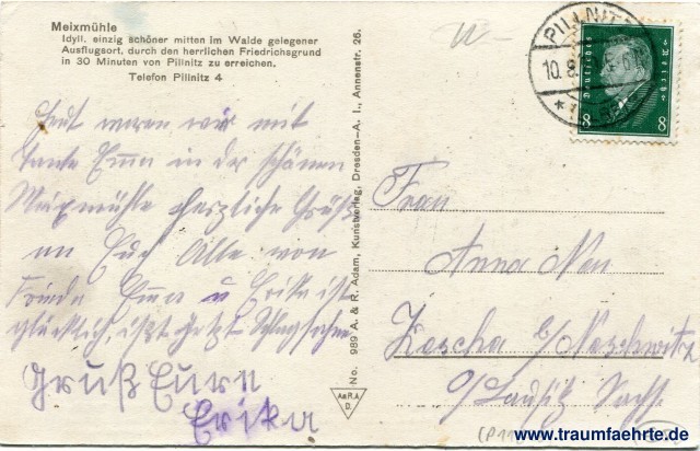 – Details – Year: ca. 1925 Postal state: postally used 1929 Inscription front: Meixmühle bei Pillnitz, Aus einem lauschig stillen Eckchen / Gibt dieses Kärtchen von mir Kunde / Meixmühle heißt das schöne Fleckchen / Bei Pillnitz in dem Friedrichsgrunde, Nachdruck verboten. Inscription back: Meixmühle, Idyll. Einzig schöner mitten im Walde gelegener Ausflugsort, durch den herrlichen Friedrichsgrund in 30 Minuten von Pillnitz zu erreichen. Telefon Pillnitz 4, No. 989 A. & R. Adam, Kunstverlag, Dresden-A. 1., Annenstr.26. Postmark(s): Pillnitz (Elbe), 10.8.29. 5-6N Please note: