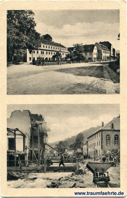 Schwarzweißfotografie mit zwei Ansichten – 1.) Hauptstraße mit Häuser, Bäumen, Laternen und Zaun vor der Flut, 2.) zerstörte Hauptstraße mit Passanten und zerstörten Häusern nach der Flut vom 8./9. Juli 1927
