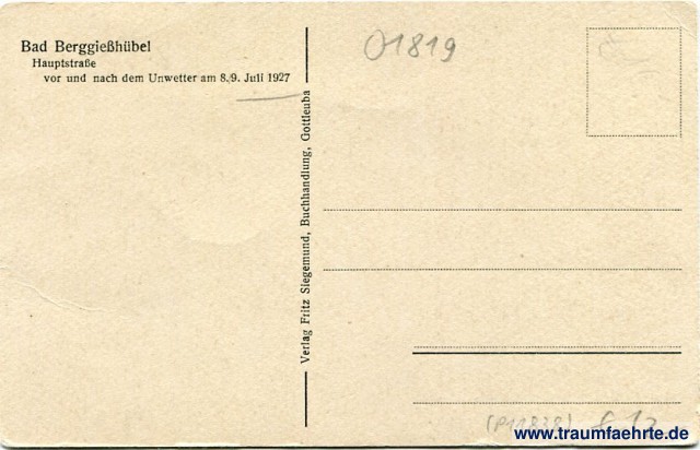 Beschriftung hinten: Bad Berggießhübel, Hauptstraße, vor und nach dem Unwetter am 8./9. Juli 1927