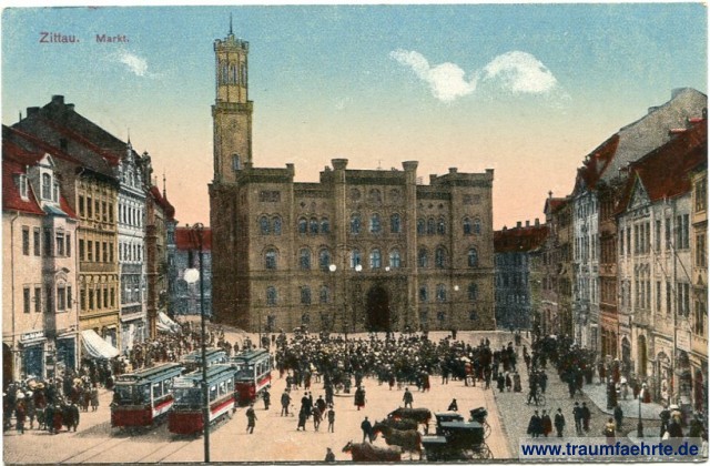 Keywords: Markets, Squares, Town Halls, Government Buildings, Towers, Trams, Horse-drawn vehicles, Lanterns, Horses, Upper Lusatia
