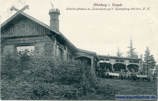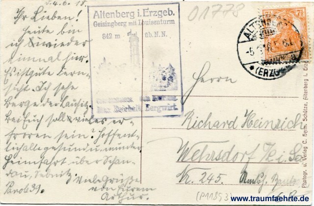 – Details – Jahr: ca. 1915 Status: gelaufen 1918 Beschriftung vorne: Altenberg i. Erzgeb. Unterkunftshaus m. Luisenturm auf d. Geisingberg, 842 m ü. N. N. Beschriftung hinten: Photogr. u. Verlag C. Herm. Schütze, Altenberg i. Erg[ebirge] Stempel: Altenberg i. Erzgeb. Geisingberg mit Luisenturm, 842 m üb. N. N. [...] Gute Bewirtung. Max Reichelt, Bergwirt.; Altenberg (Erzgeb.), -5.[6.] 18 5-6N Hinweis: