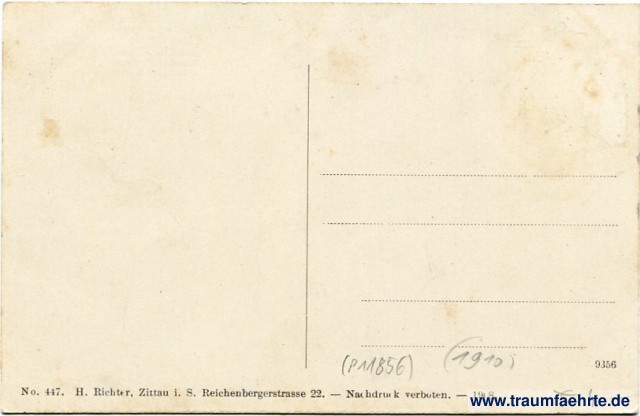 – Details – Jahr: ca. 1910 Status: ungelaufen Beschriftung vorne: Gruss aus Oybin. Beschriftung hinten: No. 447. H. Richter, Zittau i. S. Reichenbergerstrasse 22. – Nachdruck verboten. – 1908. 9356 Stempel: keine Hinweis: