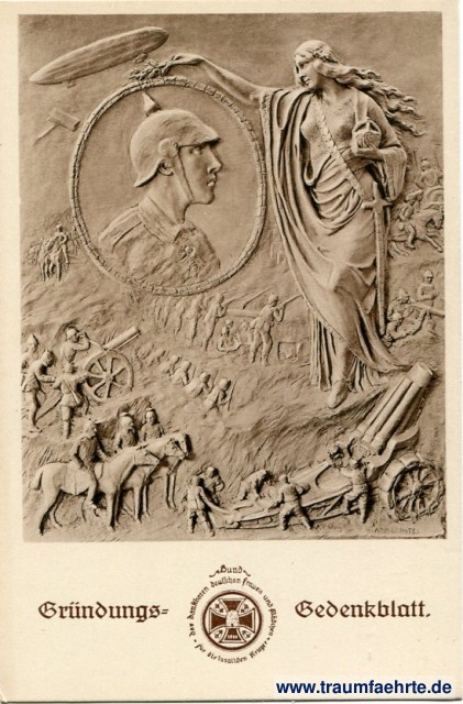 braun – Relief mit Zeppelin, Germania mit Schwert, Soldat mit Pickelhaube, Infanterie mit Gewehren, Artillerie, Kavallerie, Logo vom Bund der Dankbaren deutschen Frauen und Mädchen – Für die Invaliden Krieger