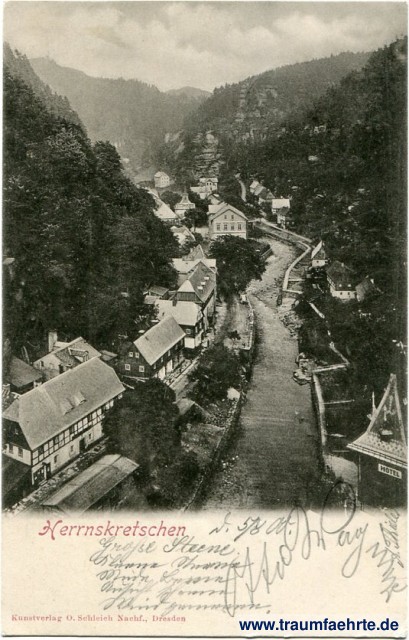 – Details – Year: ca. 1895 Postal state: postally used 1900 Inscription front: Herrnskretchen, Kunstverlag O. Schleich Nachf., Dresden Inscription back: Postkarte. Postmark(s): Rathen, 5 6 00, 5-6N.; Kötzschenbroda, * b *, -5.8.00.8-9N Please note: