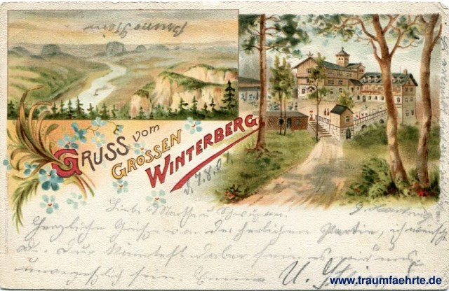 – Details – Jahr: ca. 1900 Status: gelaufen 1901 Beschriftung vorne: Gruss vom Grossen Winterberg, Otto Henning Graph. Kunstanstalt, Greiz. Beschriftung hinten: Deutsche Reichspost, Postkarte, An ... in ... Wohnung (Straße und Hausnummer) ... Stempel: Schandau, * 1 *, -8.8.01.1-2V.; Grosser Winterberg, Posthülfsstelle, [Sächsische S]chweiz; Döbeln, * 1 d, 8.8.01.11-12N Hinweis:
