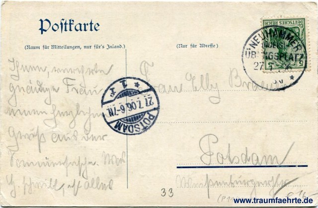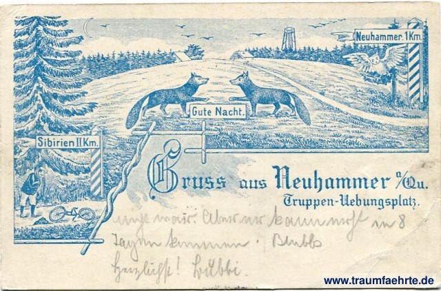 – Details – Jahr: ca. 1905 Status: gelaufen 1906 Beschriftung vorne: Gruss aus Neuhammer a/Qu. Truppen-Uebungsplatz. Gute Nacht. Neuhammer. 1km. Sibirien II Km. Beschriftung hinten: Postkarte, (Raum für Mitteilungen, nur für's Inland.), (Nur für Adresse ) Stempel: Neuhammer (Queis) Übungsplatz, [...] *, 27 7 06; Potsdam, * 1 f, 27 7 06 6-7N. Hinweis: