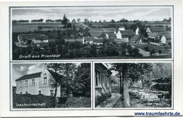 – Details – Jahr: ca. 1940 Status: ungelaufen Beschriftung vorne: Gruß aus Priestädt, Gastwirtschaft, Garten Beschriftung hinten: Verlag u. photographische Aufnahmen v. Otto Blaubach, Naumburg a. S. D 2712 35 Stempel: keine Hinweis: