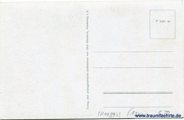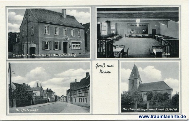 – Details – Jahr: ca. 1940 Status: ungelaufen Beschriftung vorne: Gruß aus Nessa, Gasthof u. Fleischerei Kurt Roßberg, Saal, Dorfstrasse, Kirche u. Kriegerdenkmal 1914/18 Beschriftung hinten: Verlag und photographische Aufnahmen v. Otto Blaubach, Naumburg a. S. F 2437 36 Stempel: keine Hinweis: