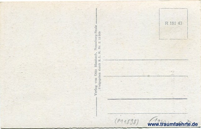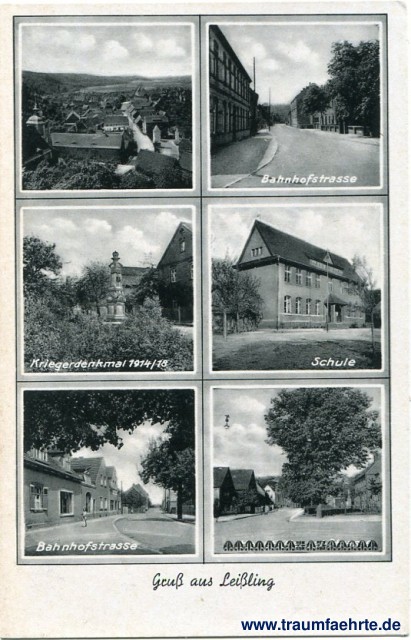 – Details – Jahr: ca. 1940 Status: ungelaufen Beschriftung vorne: Gruß aus Leißling, Bahnhofstrasse, Kriegerdenkmal 1914/18, Schule, Bahnhofstrasse, [zensiert]-Strasse Beschriftung hinten: Verlag von Otto Blaubach, Naumburg-Saale, Freigegeben durch R. L. M. Nr. E 13866, R 181 43 Stempel: keine Hinweis: