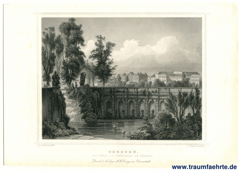 – Details – Jahr: ca. 1850 Beschriftung: Dresden. Das ehemalige Nymphenbad am Zwinger. Druck & Verlag v. G. G. Lange in Darmstadt. L. Rohbock del. J. Poppel sculp. Hinweis: