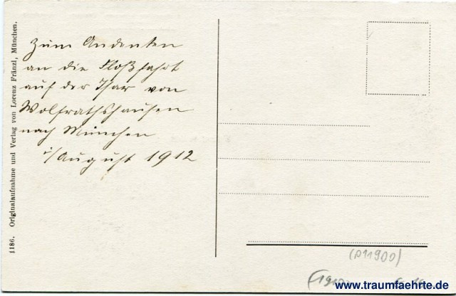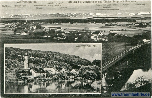 – Details – Year: ca. 1910 Postal state: postally unused Inscription front: Wolfratshausen. Blick auf die Tegernsee'er und Tiroler Berge mit Nantwein. Wallberg. Risserkogel. Gaissacher Berg. Hirschberg. Geigerstein. Guffert. Berge am Ackensee. Isartal. Juifen. Blomberg. Wolfratshausen. Inscription back: 1186 Originalaufnahme und Verlag von Lorenz Fränzl, München. Postmark(s): none Please note: