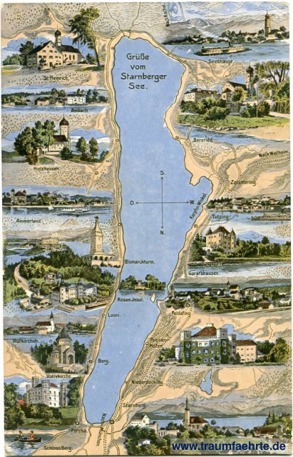 farbig – Karte vom Starnberger See (Süden oben) und siebzehn Ansichten: 1.) Sankt Heinrich mit Kirche und Kirchturm, 2.) Seeshaupt mit Starnberger See, Dampfer, Kirche und Kirchturm, 3.) Ambach mit Kirche, Kirchturm und Starnberger See, 4.) Bernried mit Kirche und Kirchturm, 5.) Kirche von Holzhausen mit Kirchturm, 6.) Ammerland mit Kirche und Türmen am Starnberger See, 7.) Tutzing mit Starnberger See und Dampfer, 8.) Ammerland, Starnberger See und Turm, Berge im Hintergrund, 9.) Bismarckturm, 10.) Garatshausen mit Schloss und Starnberger See, 11.) Aufkirchen mit Kirche und Kirchturm, 12.) Feldafing mit Kirche, Kirchturm, Starnberger See und Bergen im Hintergrund, 13.) Votivkirche bei Berg, 14.) Burg mit Türmen bei Possenhofen, 15.) Burg mit Türmen bei Percha mit Starnberger See und Boot, 16.) Starnberg am Starnbeger See mit Kirche und Kirchturm, 17.) Roseninsel mit Burg