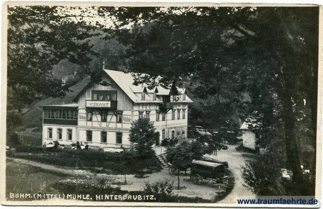Beschriftung vorne: Böhm. (Mittel) Mühle. Hinterdaubitz. Restaurant Böhm. Mühle, Schönlinde-Hinter Daubitz,...
