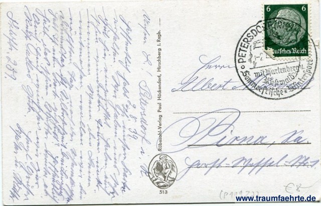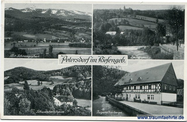 – Details – Jahr: ca. 1935 Status: gelaufen 1939 Beschriftung vorne: Petersdorf im Riesengeb. Mit Schneegruben, Zackenpartie, Schwesternheim, Jugendherberge Beschriftung hinten: Rübezahl-Verlag Paul Höckendorf, Hirschberg i. Rsgb. 513 Stempel: Petersdorf (Riesengebirge) mit Hartenberg u. Kiesewald, 2.8.39 [...], Sommerfrische, Wintersport Hinweis: