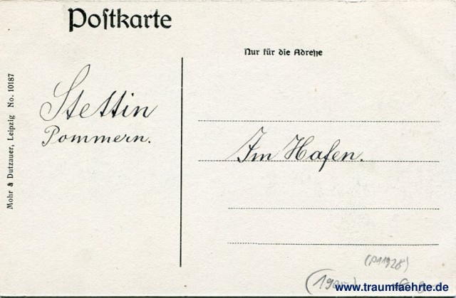 – Details – Year: ca. 1905 Postal state: postally unused Inscription front: Stettin Inscription back: Postkarte, Nur für die Adresse, Mohr & Dutzauer, Leipzig No. 10817 Postmark(s): none Please note: