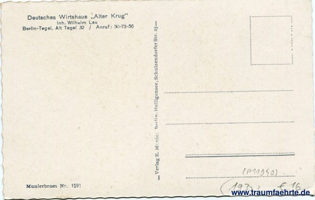 – Details – Year: ca. 1930 Postal state: postally unused Inscription front: Deutsches Wirtshaus Alter Krug, Berlin-Tegel. Inscription back: Deutsches Wirtshaus Alter Krug, Inh. Wilhelm Lau, Berlin-Tegel, Alt Tegel 32 / Anruf: 30-73-56, Munierbrom Nr. 1591, Verlag: E. Munier, Berlin-Heiligensee, Schulzendorfer Str. 23 Postmark(s): none Please note:
