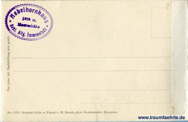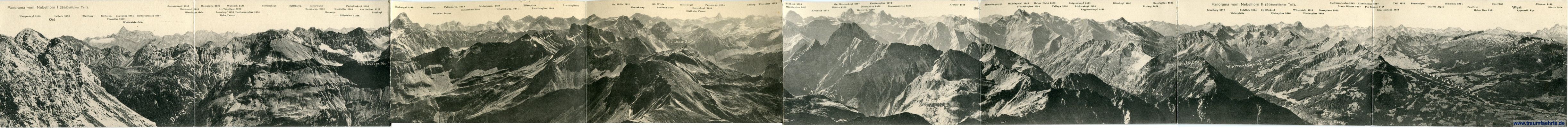 – Details – Jahr: ca. 1920 Status: ungelaufen Beschriftung vorne: Panorama vom Nebelhorn I (Südöstlicher Teil). Panorama vom Nebelhorn II (Südwestlicher Teil). Ost, West, Wengenkopf 2260, Leilach 2276, Blattberg, Rifflersp. Thaneller 2339, Zugspitze 2261, Wetterschrofen 2697, Gartnerwand 2355, Hochwand 2663, Mieminger Geb. Hochplatte 2695, Wanneck 2494, Gr.-Venediger 3660, Loreskopf 2486, Dreiherrnspitze 3505, Hohe Tauern, Schlierekopf, Sattlkarsp. Leiterwand, Rosskarsp. 2320, Kreuzsp. Fuchskarkopf 2306, Hochfeller 3505, Am Balken 2126, Zillertaler Alpen, Rosskogl, Hochvogel 2599, Schwellensp. Stubaler Ferner, Fallerkarsp. 2552, Zuckerhütl 3511, Schlenkersp. 2829, Urbeleskarsp. 2641, Eiferspitze, Zwölferspitze 2608, Pretterspitzen, Laufbacher Eck, Schneck, Gr. Wilde 2381, Kreuzkarsp. Kl. Wilde, Similaue 3599, Weisskugel, Ötzthaler Ferner, Garschkopf 2942, Parselersp. 3034, Hornbach Joch, Schochen, Ilfensp. Freispitze 2882, Rauheck 2385, Marchspitze 2607, Kreuzeck 2375, Höfts 2260, Gr. Krottenkopf 2667, Wettersp. 2898, Öfnerspitze 2578, Krottenspitze 2382, Stammerspitze 3256, Kratzer 2426, Silvrettagruppe, Mädelegabel 2646, Trettachspitze 2595, Hohes Licht 2652, Valluga 2806, Rotgrundkopf 2492, Linkerskopf 2455, Rappenseekopf 2468, Biberkopf 2600, Erzberg 2660, Regelspitze 2684, Himmelschrofen, Schafber 2677, Weissplatte, Sulzflub 2804, Zwölferkopf, Kleinspitze 2646, Warmatsgund Tal, Witterstein 2536, Zimbaspitze 2640, Seesaplana 2962, Fellhorn, Panüberschrofen 2349, Graue Hörner 2847, Kinzelspitze 2307, Piz Segnes 3118, Bifertenstock 3426, Söllereck, Tödi 3523, Berneralpen, Glarner Alpen, Glärnisch 2921, Faulfirst, Hoher Ifen 2231, Kleines Walser Tal, Churfürst, Appenzeil. Alp. Altmann 2435, Säntis 2504, Gottesacker Wände Beschriftung hinten: No. 2102. Original-Aufn. u. Eigent. v. M. Rauch, phot. Kunstanstalt, Kempten. Vor jeder Art Nachbildung ges. gesch. No. 2100. Original-Aufn. u. Eigent. v. M. Rauch, phot. Kunstanstalt, Kempten. Vor jeder Art Nachbildung ges. gesch. Stempel: 2x Nebelhornhaus, [D]okt. Allg. Immenstadt, 1929 m. Meereshöhe Hinweis: