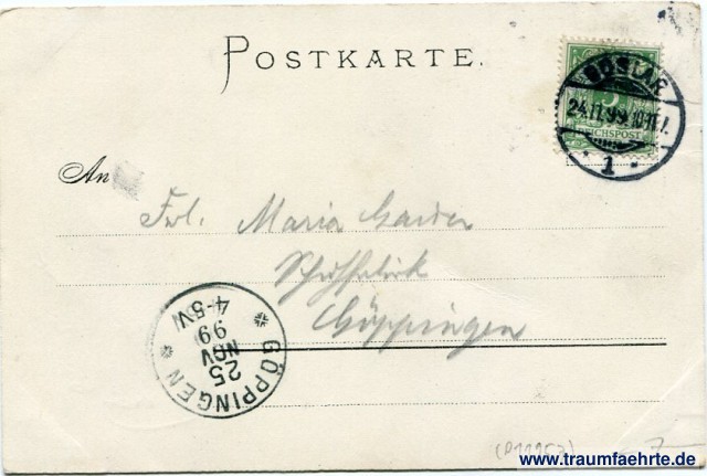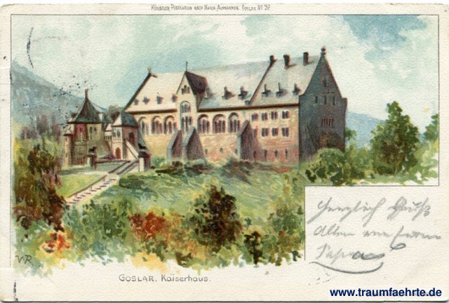 – Details – Jahr: ca. 1895 Status: gelaufen 1899 Beschriftung vorne: Goslar. Kaiserhaus. Künstler Postkarten nach Natur-Aufnahmen. Goslar No 97. Reinicke & Rubin, Magdeburg. WR Beschriftung hinten: Postkarte. Stempel: Goslar, * 1 *, 24.11.99.10-11[N].; Göppingen, 25 Nov 99, 4-5V Hinweis: