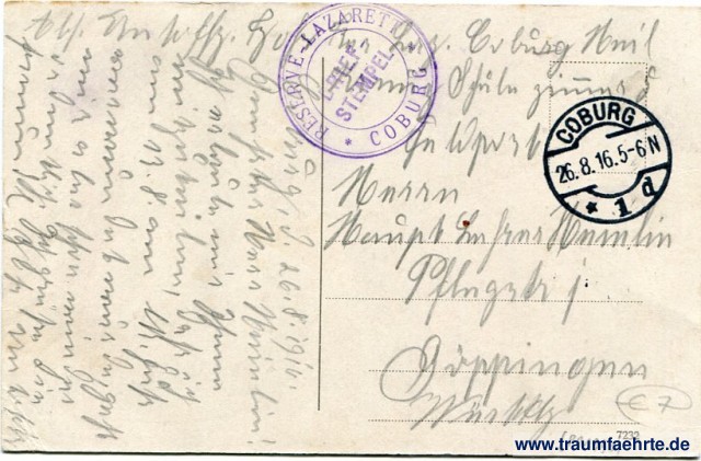 – Details – Jahr: ca. 1915 Status: gelaufen ohne Briefmarke (Feldpost), 1916 Beschriftung vorne: Coburg, Marktplatz Beschriftung hinten: 7232 Stempel: Coburg, * 1 d, 26.8.16.5-6N; Reserve-Lazarett Coburg Hinweis: