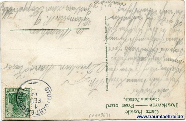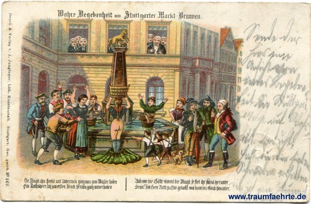 – Details – Jahr: ca. 1910 Status: gelaufen 191x Beschriftung vorne: Wahre Begebenheit am Stuttgarter Markt-Brunnen. Die Magd ohn Hemd und Unterrock ging ans Wasser holen / Ein Ratsherr sah zum ersten Stock heraus ganz unverholen / Und wie die Kälte nimmt die Magd, so fiel ihr Kleid herunter / Drauf sich Herr Rath zu Tod gelacht und kam ins Grab hinunter. Druck & Verlag v. J. Junginger, Lith. Kunstanstalt, Stuttgart. Ges. gesch. No 307. Beschriftung hinten: Carte postale, Postkarte – Post card, Cartolina Postale. Druck u. Verlag v. J. Junginger, Lith. Kunstanstalt, Stuttgart. Nachdr. Verboten. Stempel: Stuttgart-Gaisburg, 1 Feb 1[...] Hinweis:
