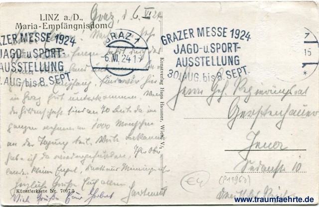 – Details – Jahr: ca. 1920 Status: gelaufen 1924, Briefmarke entfernt Beschriftung vorne: kein Text Beschriftung hinten: Linz a./D., Maria-Empfängnisdom, Künstlerkarte Nr. 7007/5, Kunstverlag Hans Hausner, Wien, V/1 Stempel: 2x Grazer Messe 1924, Jagd- und Sport-Ausstellung 30. Aug. bis 8. Sept.; 1½x Graz 1, * * *, -6. VI. 24 15 Hinweis:
