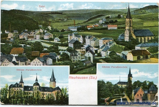 – Details – Year: ca. 1915 Postal state: postally used 1917 Inscription front: Neuhausen (Sa.), Total, Schloss Purschenstein, Schloss Purschenstein Inscription back: Verlag Julius Schuffenhauer, Neuhausen i. Sa. Postmark(s): Neuhausen (Bz. Dresden), 12.8.17 4-5N Please note: