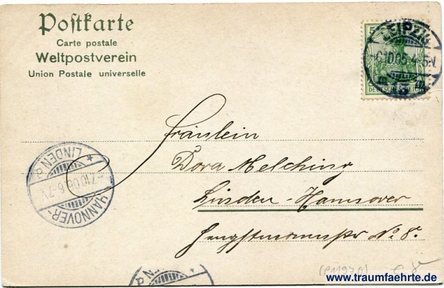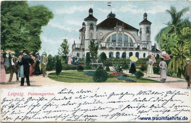 – Details – Jahr: ca. 1900 Status: gelaufen 1905 Beschriftung vorne: Leipzig. Palmengarten. 9354 Beschriftung hinten: Postkarte, Carte postale, Weltpostverein, Union Postale universelle Stempel: Leipzig, III 13 III, -6.10.05. 4-5V.; 1½x Hannover-Linden, * d, -7.10.05. 6-7V. Hinweis: