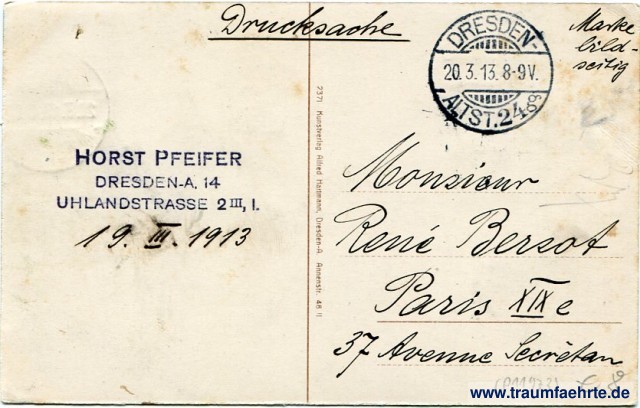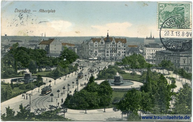 – Details – Jahr: ca. 1910 Status: gelaufen 1913 Beschriftung vorne: Dresden – Albertplatz Beschriftung hinten: 2371 Kunstverlag Alfred Hartmann, Dresden-A., Annenstr. 48 II. Stempel: 2x Dresden-Altst. 24, g, 20.3.13. 8-9 V. Hinweis: