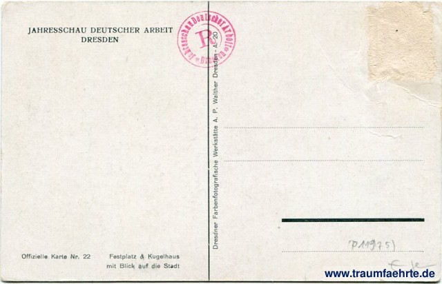 Inscription back: Jahresschau Deutscher Arbeit Dresden, Offizielle Karte No. 22, Festplatz & Kugelhaus mit Blick auf die Stadt, Dresdner Farbenfotografische Werkstätte A. P. Walther Dresden-A. 20